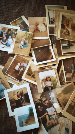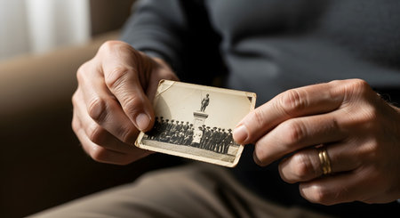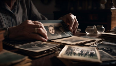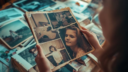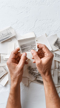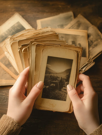 Hands hold gently old photographs that evoke nostalgia and a strong sense of sentimentality in a cozy atmosphere.