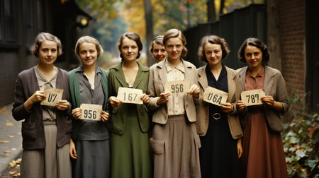 Black and white photograph of women from the National League of Women Voters holding blank signs, evoking a vintage and historical feeling.