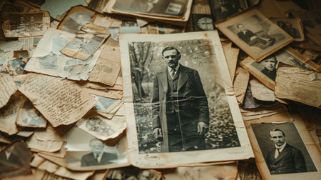 A man in a hat contemplates a collection of vintage photographs, reflecting on the history and memories they evoke. The scene captures a sense of nostalgia and exploration.