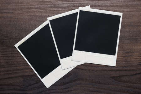 A group of various Polaroid frames is neatly arranged on a flat surface. The frames are different sizes, colors, and styles, creating a visually interesting display. Some frames are empty, while others hold pictures.