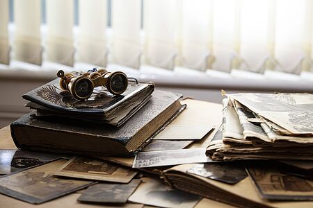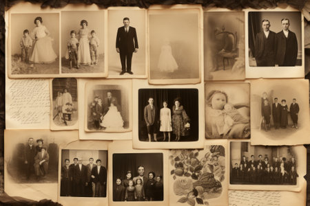 Old vintage photos on an antique table, surrounded by books, evoke nostalgia and timelessness for antique lovers.