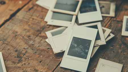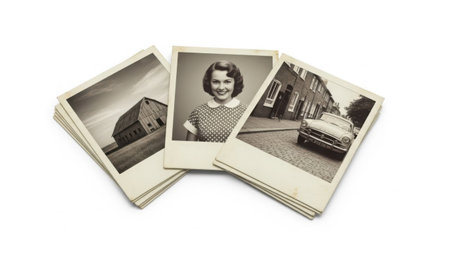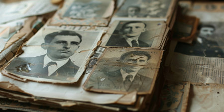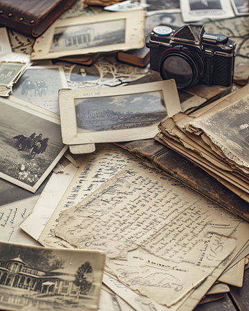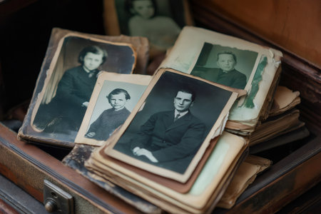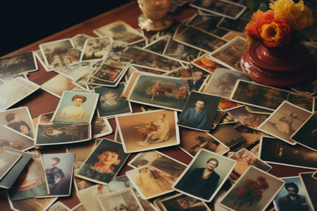 Old, vintage photographs rest on an antique table, creating a warm, nostalgic atmosphere perfect for antique shops or vintage studios.