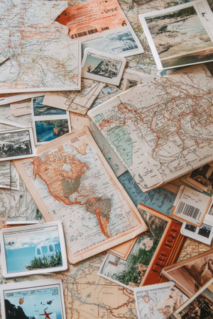 An old, well-worn map with an empty space for a photo, surrounded by scattered postcards and travel souvenirs, evoking feelings of longing for distant places and lost time