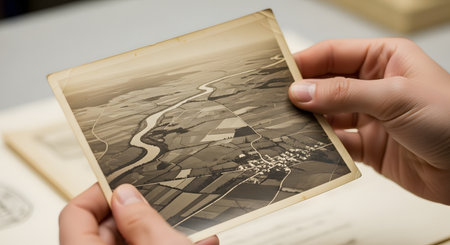 A pair of hands holds an old, sepia-toned aerial photograph, showing a meandering river, a small village, and patchwork fields from above. The image evokes a sense of history, memory, and archival research.