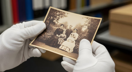 An archivist or curator wearing white cotton gloves carefully holds a vintage sepia-toned photograph of a family from the Victorian or Edwardian era. The background is blurred, suggesting a library, archive, or museum setting.