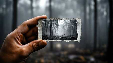 A hand holds a vintage black and white photograph of a misty forest, showcasing a serene and mysterious atmosphere that evokes nostalgia and contemplation.