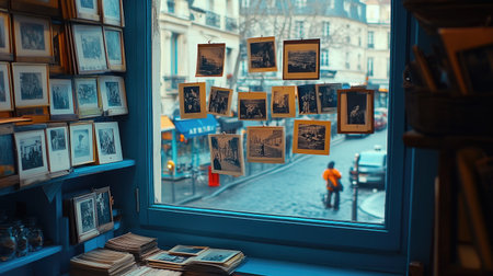A captivating window display featuring vintage photographs hanging above a cobblestone street. The serene scene showcases urban charm and a nostalgic atmosphere.