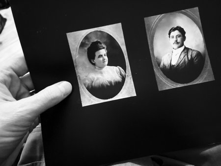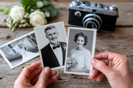 Warm antique photographs are held in hands, showcasing cherished memories and a nostalgic atmosphere that invites reflection.
