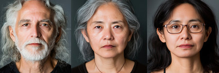 Portrait, Triptych, Three Diverse Individuals, Straight Face, Headshot, Minimalism, Gray Background