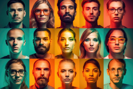 Close up portraits of diverse international individuals showcasing various expressions and backgrounds in a simple studio setting