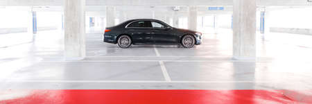 Luxurious Mercedes S Class, standing in an empty underground parking lot. Side view of the silhouette. Katowice, Poland - 02/02/2021