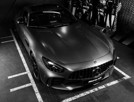 Sankt-Petersburg, Russia, January 12, 2018 : Mercedes-Benz AMG GTR 2018 V8 Bi-turbo exterior details. Side view. Car exterior details. Black and white