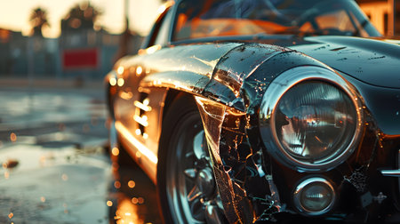 Vintage car with broken glass and splashes of water, closeup
