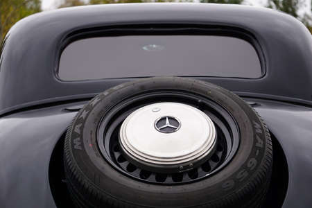 Mercedes Benz logo on a black vintage car. Close-up. Mercedes-Benz is a German automobile manufacturer. The brand is used for luxury automobiles, buses, coaches and trucks.