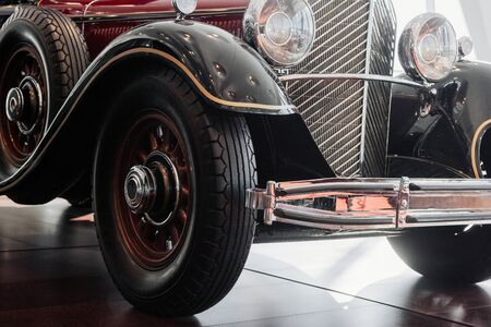 Close up front and side view of a red retro car with chrome spotlight, bumper and radiator, narrow wheels with an arch above, a spare tire and wooden elements in the disc.