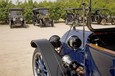 Antique cars parked in an orange grove at horseless carriage rally in Santa Paula, CA