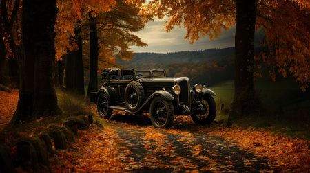 Vintage german car on the road in autumn forest. Retro second world war period.