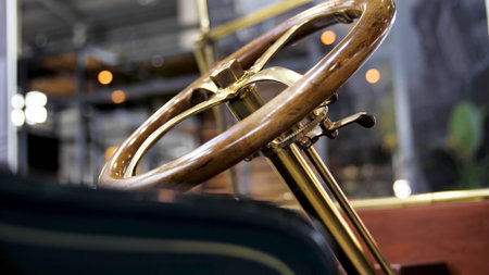 Close up of classic car details at the exhibition. Media. Retro cabriolet car and the golden steering mechanism with a wooden polished wheel.