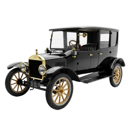 A detailed view of a black vintage Ford Model T touring car, a historical automobile, presented isolated on a clean white background.