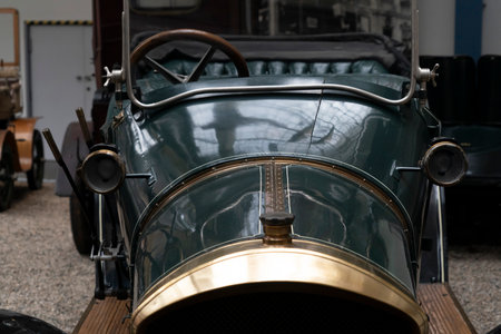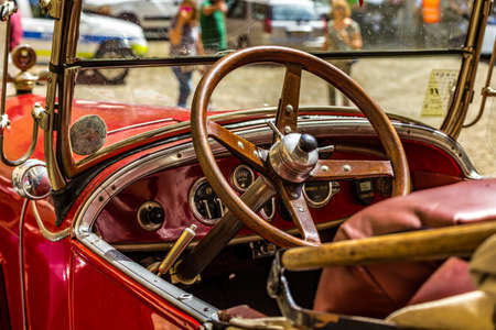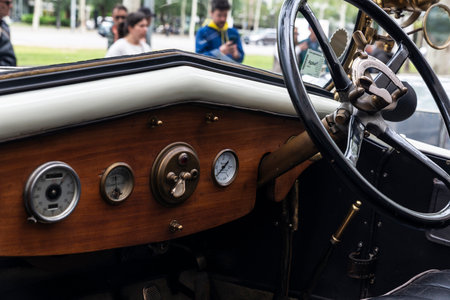 Barcelona, Spain - April 6, 2024: Steering wheel and dashboard of an old retro car from the 1920s of the brand Hispano Switzerland parked on a street in Barcelona, Catalonia, Spain
