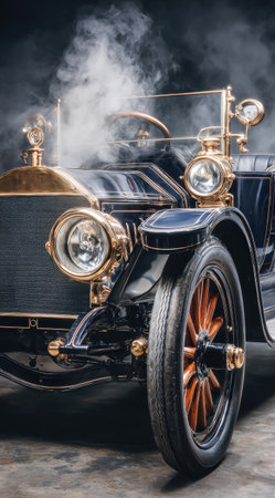 Vintage car with smoke on dark background. Retro car. Vintage car.