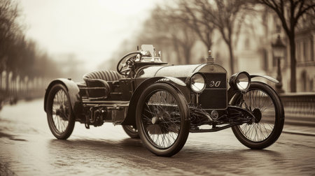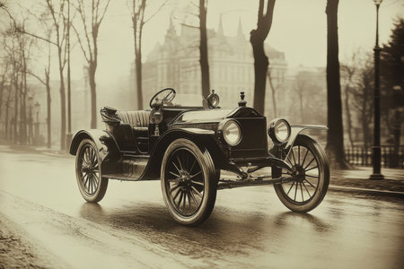 A vintage automobile stands on a wet cobblestone street, surrounded by leafless trees in a historic area. Morning mist adds a nostalgic feel to the quiet scene.