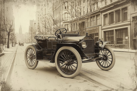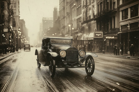 A vintage car drives along a busy historical street, capturing the essence of the early 1900s. The driver, dressed in period attire, exudes a sense of sophistication as the urban landscape unfolds behind him.