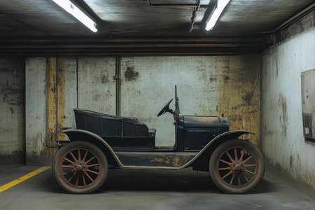A classic vintage car is parked in a neglected underground garage. The dim lighting highlights the car's old features and the worn surroundings, creating a nostalgic atmosphere.