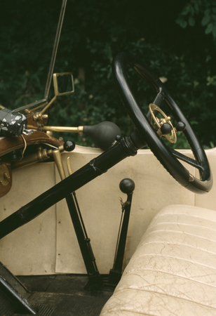 Vintage car interior with steering wheel and dashboard in the forest.