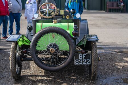 Barcelona, Spain - April 6, 2024: Old retro car from the 1920s of the brand Darracq of 1905 parked on a street in Barcelona, Catalonia, Spain