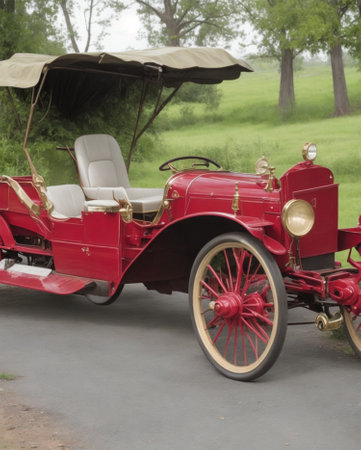 A vintage automobile with a shiny body rests on a gravel path near a classic house. Lush greenery surrounds the area, suggesting a tranquil setting in the early 20th century. A hint of nostalgia pervades the scene.