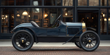 Vintage Car Displayed in a Showroom with Shops and History Vibe