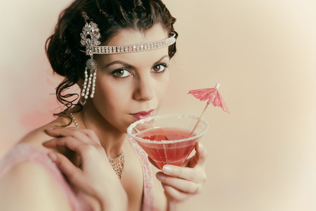 Beautiful young vintage 1920s woman with headband and flapper dress drinking a cocktail