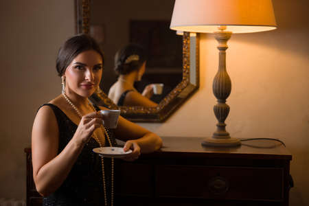 Beautiful blonde woman in twenties years clothes with cup of coffee on dark background