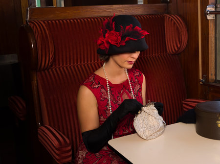 Attractive 1920s woman in red flapper dress and cloche hat posing in the 1927 first class interior of an authentic steam train