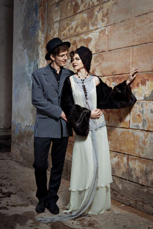 Handsome man and beautiful young woman in the style of the 1920s. Fashion clothes, make-up and hair in luxurious retro style.