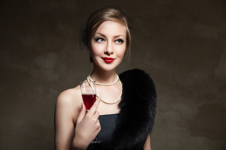 Portrait of beautiful woman with glass red wine Retro style