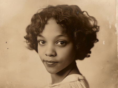Photorealistic Teen Black Woman with Brown Curly Hair vintage Illustration.