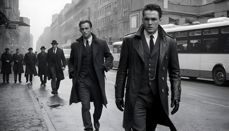 A black-and-white photograph depicts a group of men in 1940s-style clothing walking down a city street. The two men in the foreground, dressed in trench coats and suits, exude a sense of urgency and determination. The background features other pedestrians and vintage buses, emphasizing the historical urban setting.