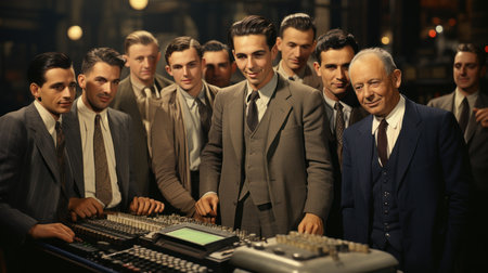 Black and white photograph of a group of workers after a working day. Old photo. Generative AI