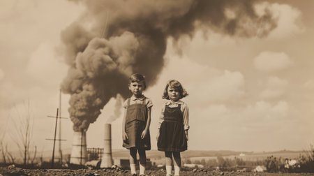 Children Power Plant Environmental Pollution Problem Global Warming Concept Sepia