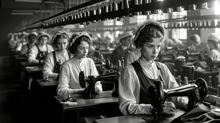 A black and white photograph of a group of women in a sewing factory each operating a seamstress machine