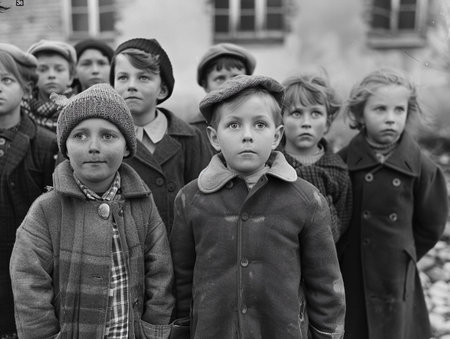 Three children sit together on a cobblestone street, dressed in vintage clothing typical of a past era. They appear to be reflecting, with serious expressions that convey a sense of resilience and nostalgia, surrounded by an urban backdrop.