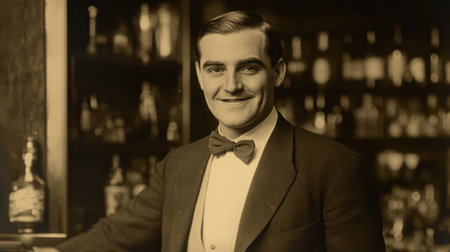 A young man dressed in a suit and bow tie smiles while posing behind a bar filled with various bottles, capturing a moment of hospitality and charm from the past.