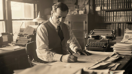 In a vintage office setting, a dedicated worker on writing documents surrounded by stacks of papers and classic typewriters under warm sunlight.