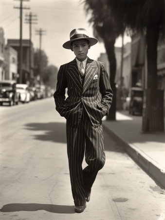 A stylish couple, dressed in formal vintage fashion reminiscent of the 1940s, walks hand-in-hand down a cobblestone street. The man wears a pinstripe suit and fedora, while the woman wears a tweed jacket, floral skirt, and gloves, with a vintage car parked in the background.
