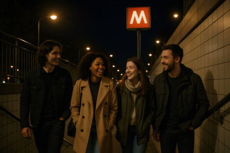 Four cheerful young friends walking and chatting together while exiting a subway station at night, enjoying the vibrant city life around them