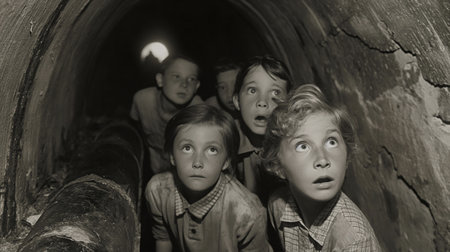 Group of children sheltering in an underground tunnel. Expressions of anxiety and confusion. The impact of war on young lives