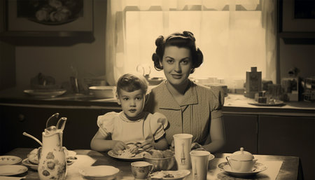 Vintage mother with her two daughters have breakfast at home. Monochrome, grunge textures, intentionally styled to the 1950s Retro family concept background at home happy