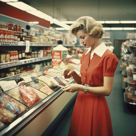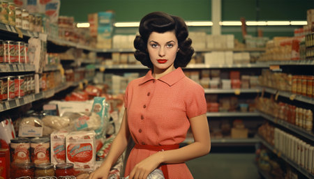 Woman in grocery store vintage design. Retro Girl with Groceries Healthy Food. Pop Art. Shopping in supermarket buying products concept old